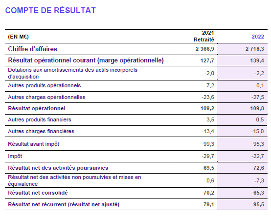 Le Résultat net récurrent4 progresse1 de 20,7% à 95,5 millions d’euros, permettant de dégager un bénéfice net récurrent par action6 de 0,53 euro, supérieur à l’objectif fixé de 0,50 euro pour l’exercice 2022.