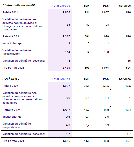 Le « Pro Forma 2021 » correspond au Chiffre d’affaires et au ROC à fin 2021 retraités corrigés des effets de change et de variations de périmètre (acquisitions et cessions). Il sert de base au calcul des taux de croissance à normes et périmètre constants.
