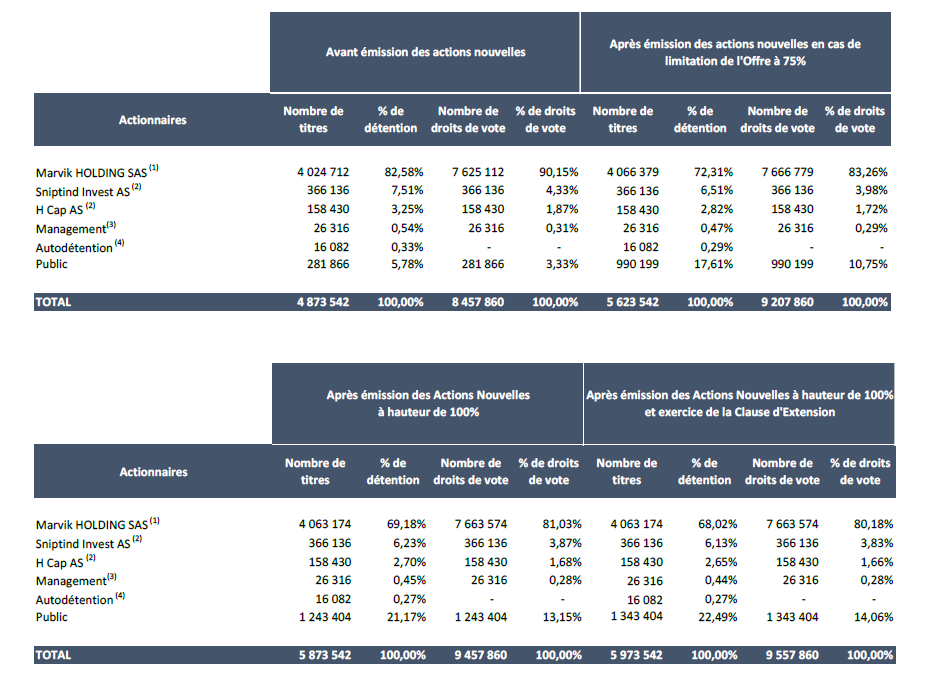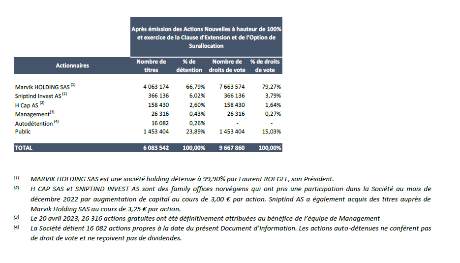 - Taille de l’Offre : Augmentation de capital d’environ 5,20 M€ (correspondant à 17,0% du capital et 10,6% des droits de vote en cas d’Offre à 100%) pouvant être portée à environ 5,72 M€ en cas d’exercice intégral de la clause d’extension (correspondant à 18,4% du capital et 11,5% des droits de vote), et à un maximum d’environ 6,29 M€ en cas d’exercice intégral de l’option de surallocation (correspondant à 19,9% du capital et 12,5% des droits de vote).
