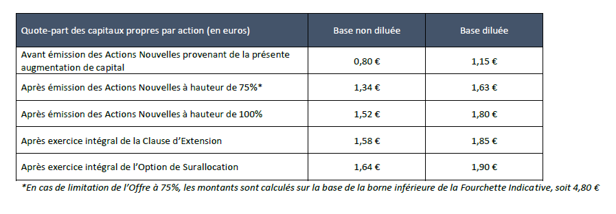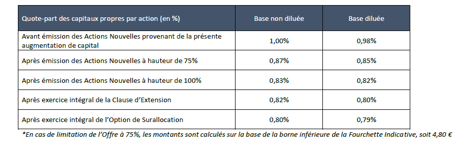 L’incidence de l’Offre sur les capitaux propres et la participation dans le capital de la Société d’un actionnaire qui détiendrait à la date du Document d’Information 1% du capital social de la Société et ne souscrivant pas à celle-ci, sur la base du nombre d’actions composant le capital de la Société à la date du Document d’Information et d’un Prix d’Offre égal au point médian de la Fourchette Indicative, serait la suivante :