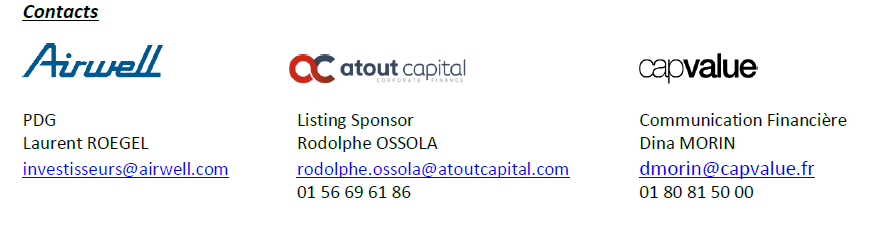 Ces informations ne constituent pas une offre de vente ou de souscription, ni une sollicitation de souscription ou d’achat de titres de GROUPE AIRWELL aux États-Unis, au Canada, au Japon ou en Australie ni dans aucun autre pays à l’exception de la France.