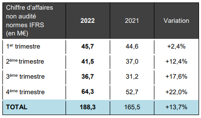 Accélération de l’activité en 2022 : 188,3 M€ (+13,7%)