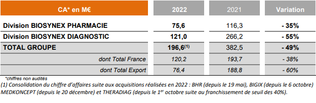 BIOSYNEX a réalisé en 2022 un chiffre d’affaires de 196,6 M€, en diminution de 49% par rapport à l’exercice précédent (-50% en organique hors effet des acquisitions de l’exercice). Comme prévu, le Groupe a dû faire face, dès le deuxième trimestre, à un fort recul des ventes de produits Covid-19 en Europe. La baisse représente ainsi plus de 200 M€ sur toute l’année, les produits Covid-19 affichant en 2022 un revenu de 140,9 M€ contre 342,2 M€ en 2021.